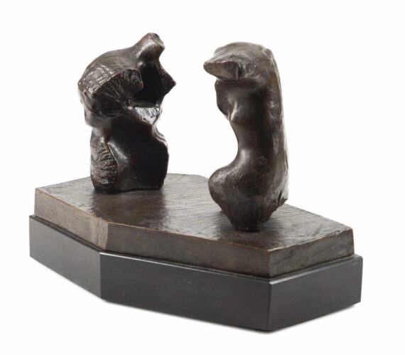A bronze sculpture on a black marble base by Henry Spencer Moore (British, 1898-1986), titled Two Torsos, depicting two torsos in movement, was from an original 1960 plaster cast and stood 6 ¾ inches tall. It was signed to the top of [Read More]